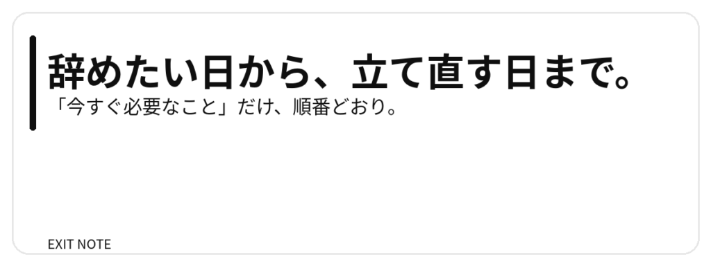 退職の手順・生活のつなぎ・収入づくりを、「今すぐ必要な順」に並べています。